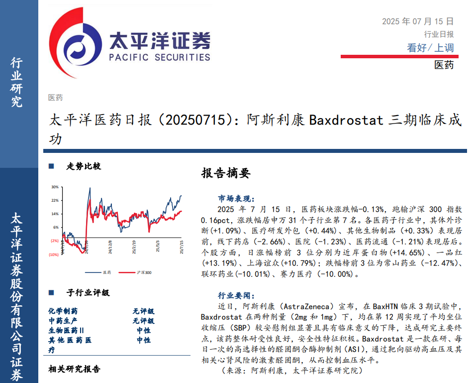 2025年7月15日,医药板块涨跌幅-0.13%,跑输沪深300指数0.16pct,涨跌幅居申万31个子行业第7名。各医药子行业中,其体外诊断(+1.09%)、医疗研发外包(+0.44%)、其他生物制品(+0.33%)表现居前,线下药店(-2.66%)、医院(-1.23%)、医药流通(-1.21%)表现居后。个股方面,日涨幅榜前3位分别为近岸蛋白物(+14.65%)、一品红(+13.19%)、上海谊众(+10.79%);跌幅榜前3位为常山药业(-12.47%)、联环药业(-10.01%)、赛力医疗(-10.00%)。